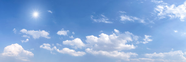 对着太阳的云排成一行。好天气。蓝色的天空。