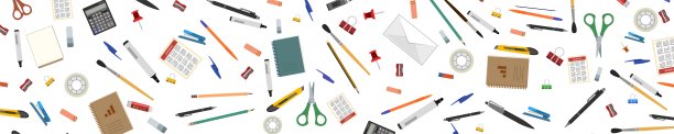 文具。水平背景广告商店,公司。插图。孤立在白色背景上。铅笔,钢笔,毡尖笔,刷子,橡皮,剪刀,胶带。向量