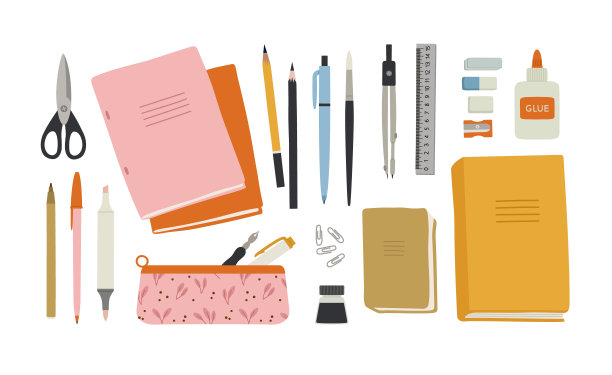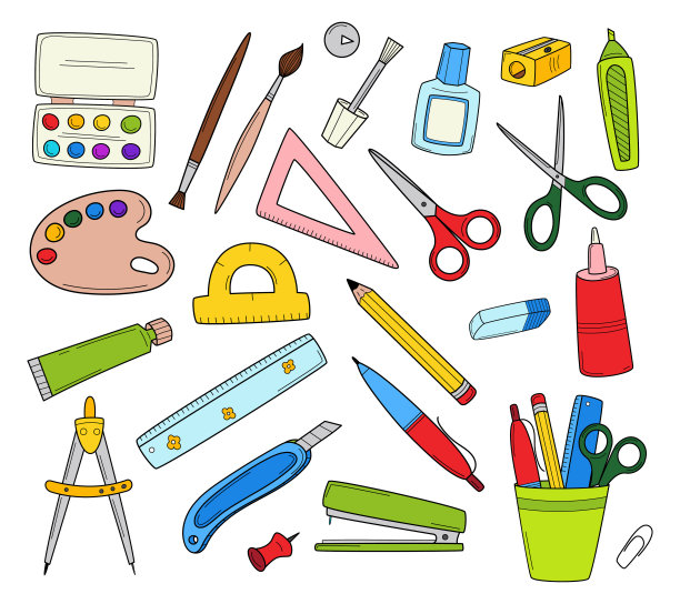 一套鲜艳多彩的文具。供孩子学习的教育用品。
