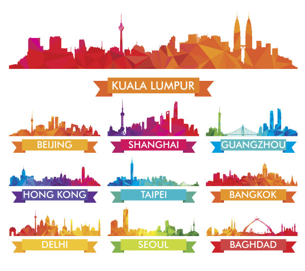 用现代建筑勾勒出中国广州城市的天际线,并在白色上勾勒出孤立的倒影。