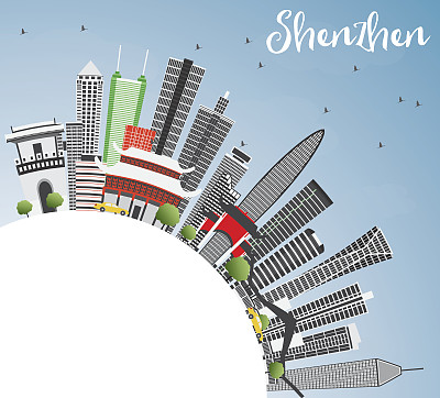 深圳中国城市天际线,彩色建筑,蓝天和复制空间。
