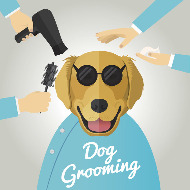 宠物美容的狗和猫在平面卡通手绘背景插图。用于美容院海报或横幅的主要工具