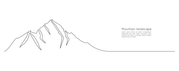 山脉景观的一幅连续线条画。在简单的轮廓风格坐骑的俯视图。冒险远足和冬季运动概念孤立在白色背景上。线性向量插图
