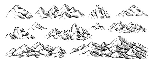 山的风景。线素描。插图集。矢量可编辑轮廓笔画粗细。