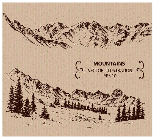 洛基山脉草图。手绘自然景观版画。徒步旅行和爬山顶的背景。风景秀丽的悬崖和山峰全景。高原风光。矢量轮廓岩脊设置