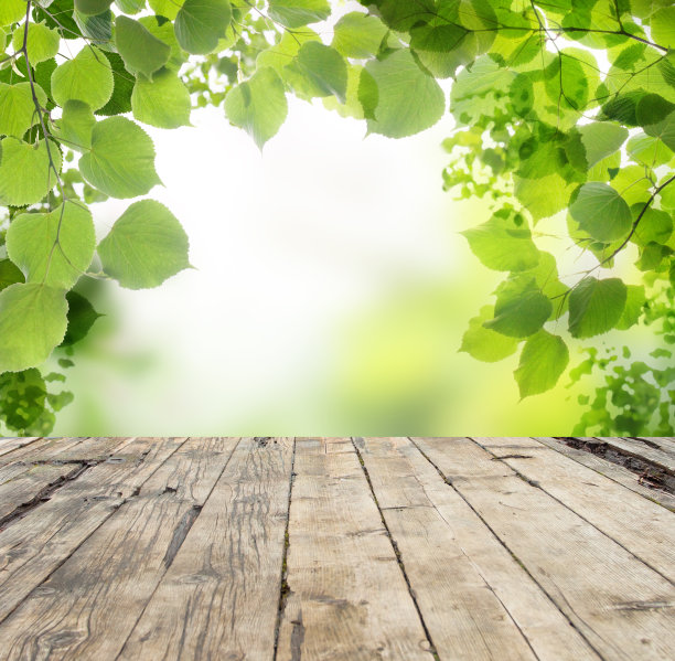 木质桌面与模糊的橙色花园在早上。为蒙太奇产品展示或设计重点视觉