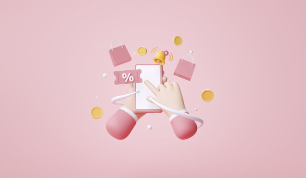 手持智能手机触摸在线购物折扣卡通3d卡通横幅网站ui粉红色背景3d渲染插图
