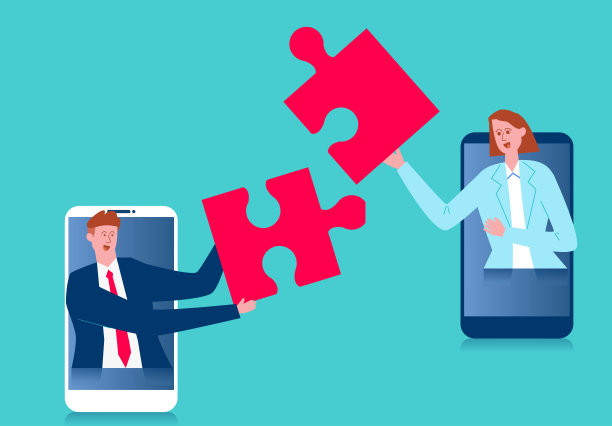 全球商业合作与交流,男商人和女商人从智能手机上拿出拼图