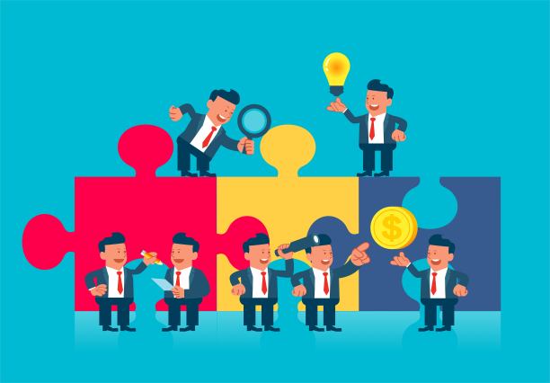 在商业合作的概念下,三个商人组成了一个人形金字塔合并的拼图