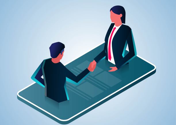 智能手机上商人与女商人等距握手,在线协议与合作,全球商务贸易与沟通。